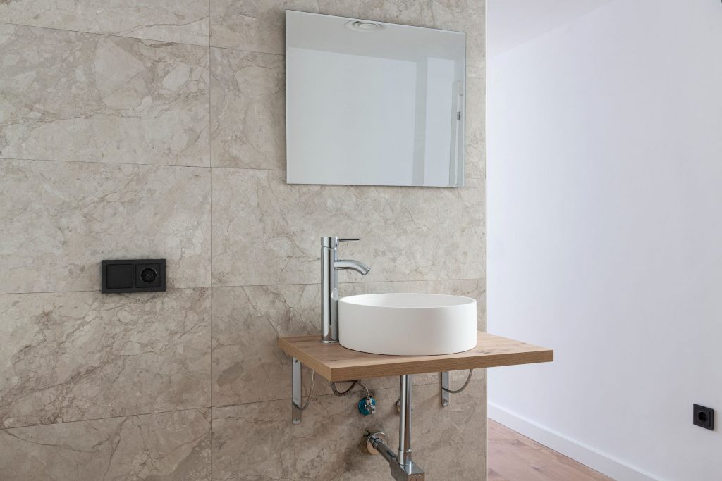 • Instalación de fontanería en tubería de PPR (polipropiluno reticulado) para agua fría y caliente y saneamiento en PVC. • Llave de corte general y cada estancia húmeda. • Platos de ducha planos de resina. • Sanitarios de color blanco con griferías monomando cromadas.